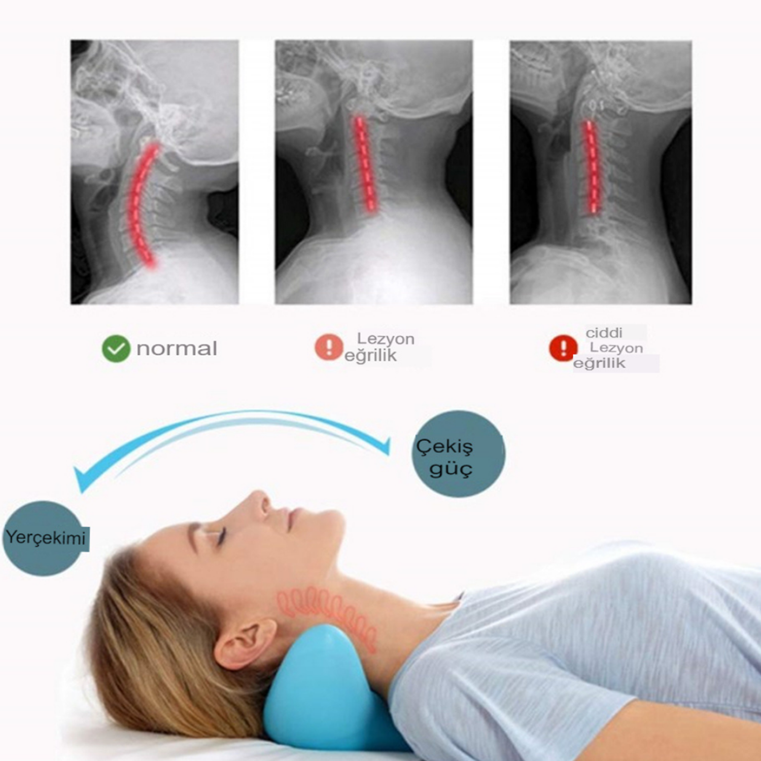 ?Kullanımı kolay? sadece servikal çekiş yastığına uzanın ve başınızın ağırlığının üst omuz ve anterior boyun kaslarını yavaşça germesine izin verin. Her seferinde 8 dakika kullanılması tavsiye edilir.